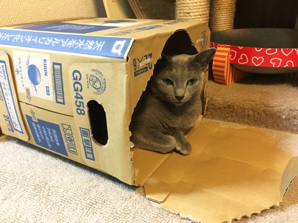 後ろの高いキャットタワーより、娘が遊んで放置したダンボールに入っちゃいます