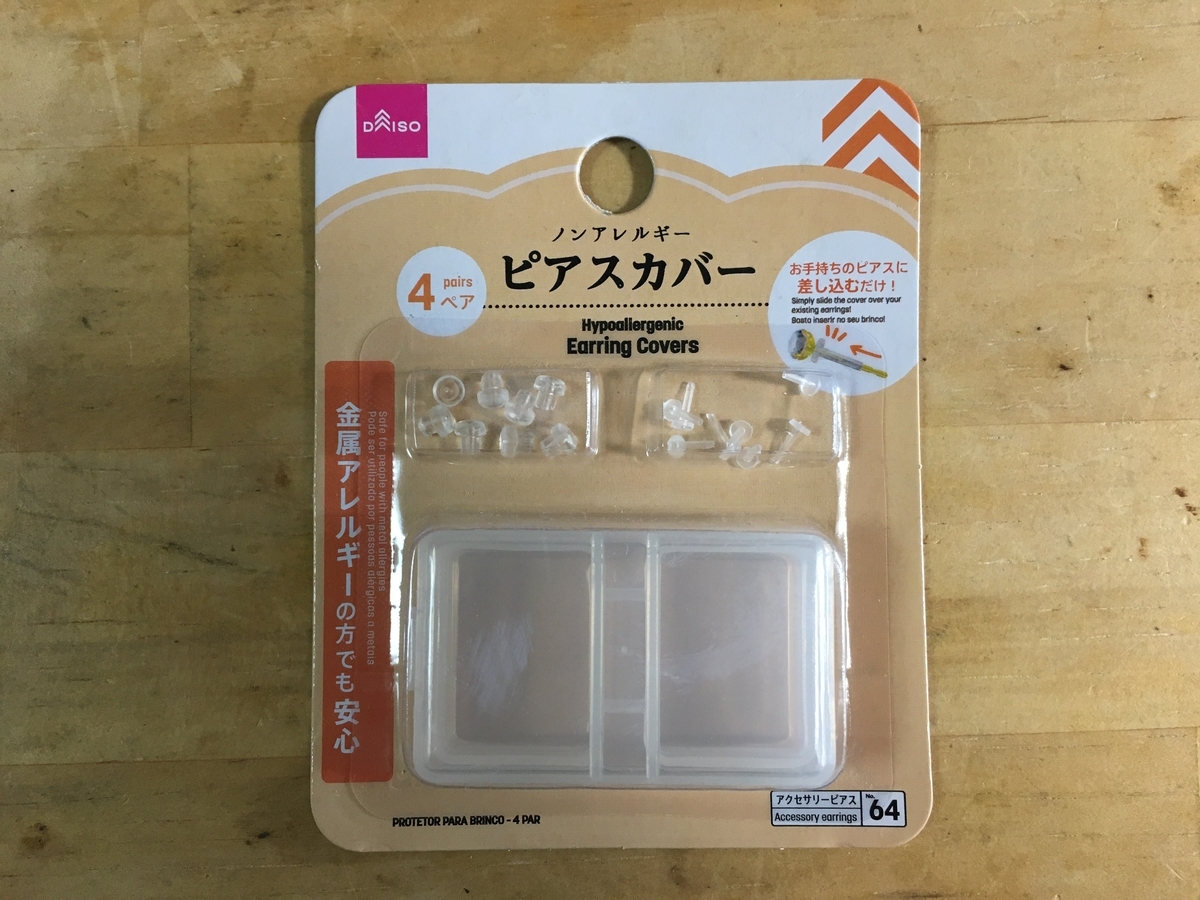 そこで、まずはダイソーのピアスカバー。つけるだけ簡単。